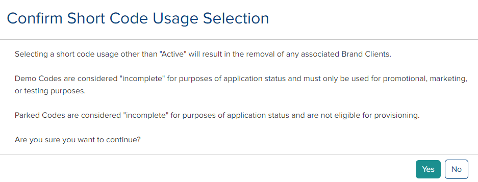 Note: A Confirm Short Code Usage Selection dialog appears when you choose Demo or Parked options. If any Associated Brand Clients have already been selected, they will be removed if you change the usage to Demo or Parked when you click Yes to confirm your selection.